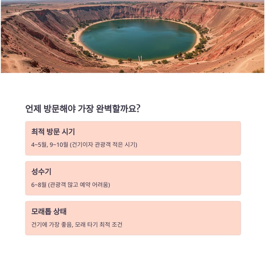 반면 12월부터 3월까지는 여름철로, 기온이 30도를 넘는 날이 많아 사막 활동 시 더위에 주의해야 해요. 이 시기에는 오전이나 늦은 오후 투어를 선택하는 것이 좋습니다.