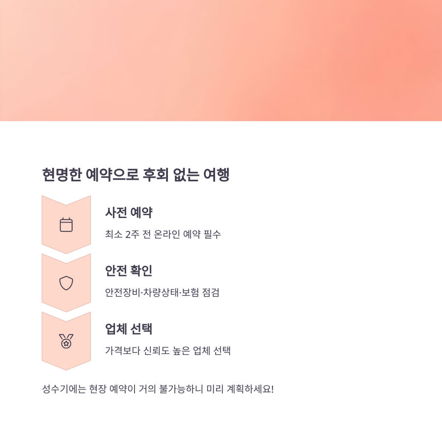 가장 안전한 방법은 최소 2주 전에 온라인으로 예약하는 것이에요. 신뢰할 수 있는 여행 플랫폼을 통해 예약하면 언어 문제도 없고, 가격 비교도 쉽게 할 수 있어요.