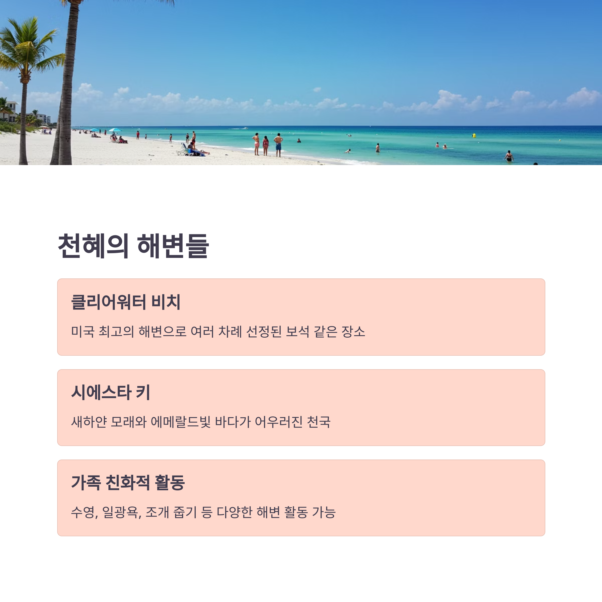 클리어워터 비치는 하얀 모래사장과 맑은 바다로 유명하며, 가족 친화적인 분위기를 갖추고 있어요.