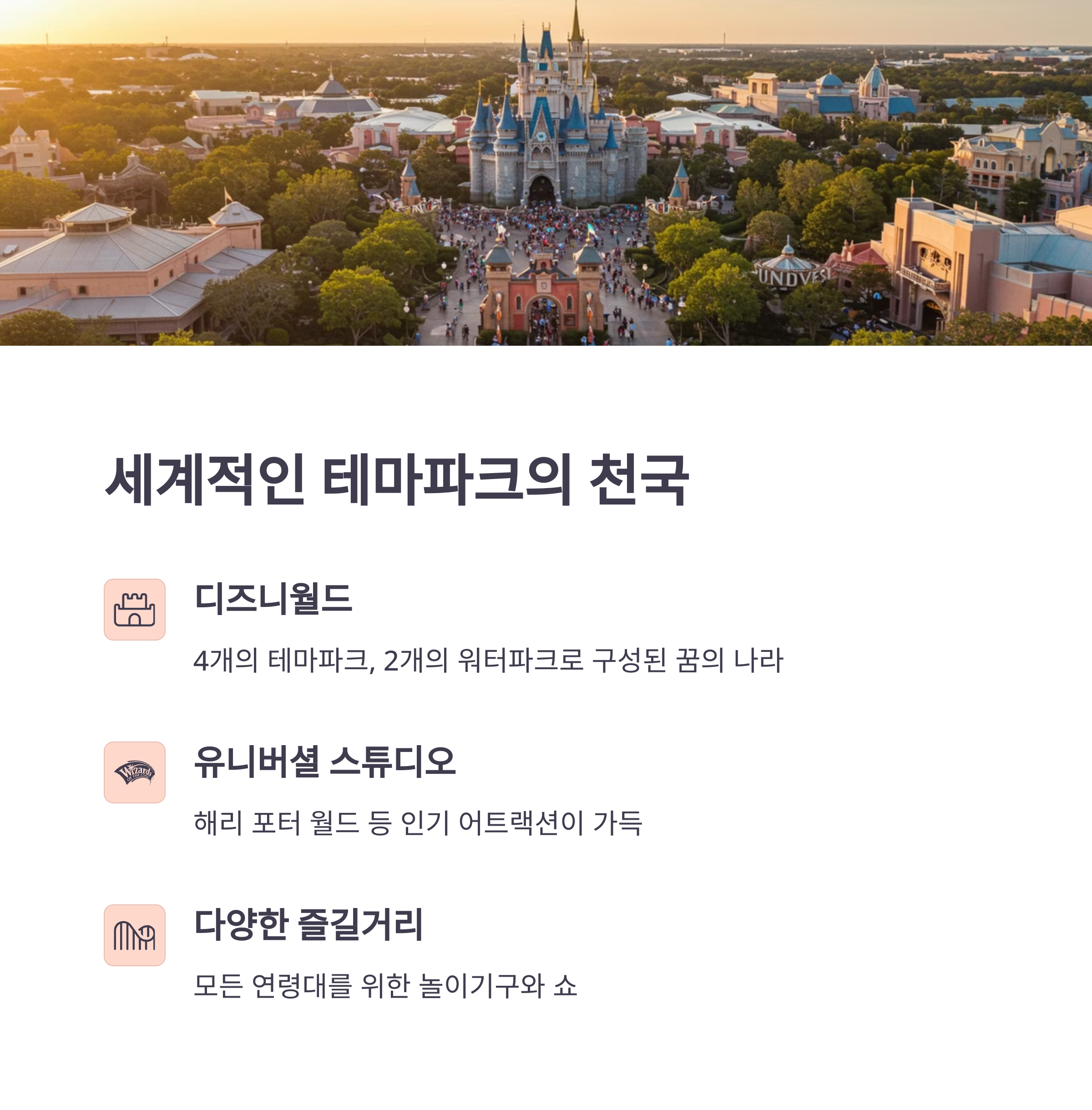 세계적인 테마파크부터 아름다운 해변, 풍부한 자연환경까지 한 번의 여행으로 다양한 경험을 할 수 있어요.