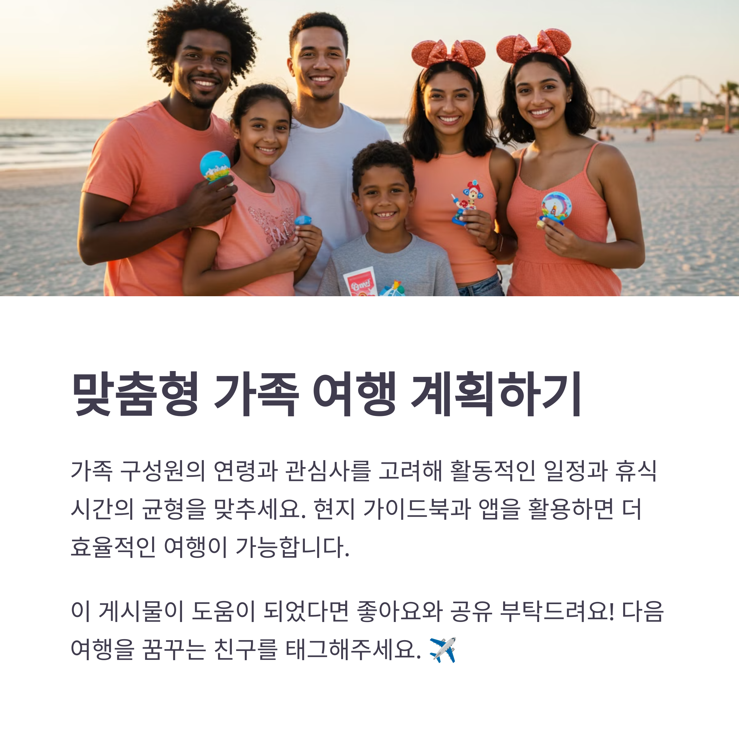 가족의 연령대와 관심사에 맞게 일정을 계획한다면, 모두가 만족할 수 있는 최고의 추억을 만들 수 있을 거예요!
