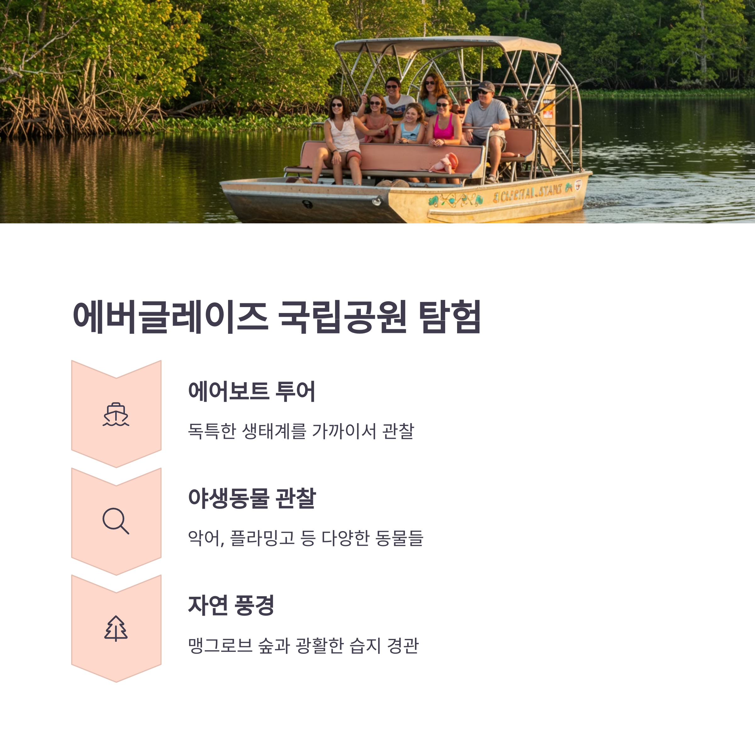플로리다는 독특한 생태계를 자랑하는 곳이에요. 에버글레이즈에서는 악어, 플라밍고, 매너티 등 다양한 야생동물을 관찰할 수 있어요.