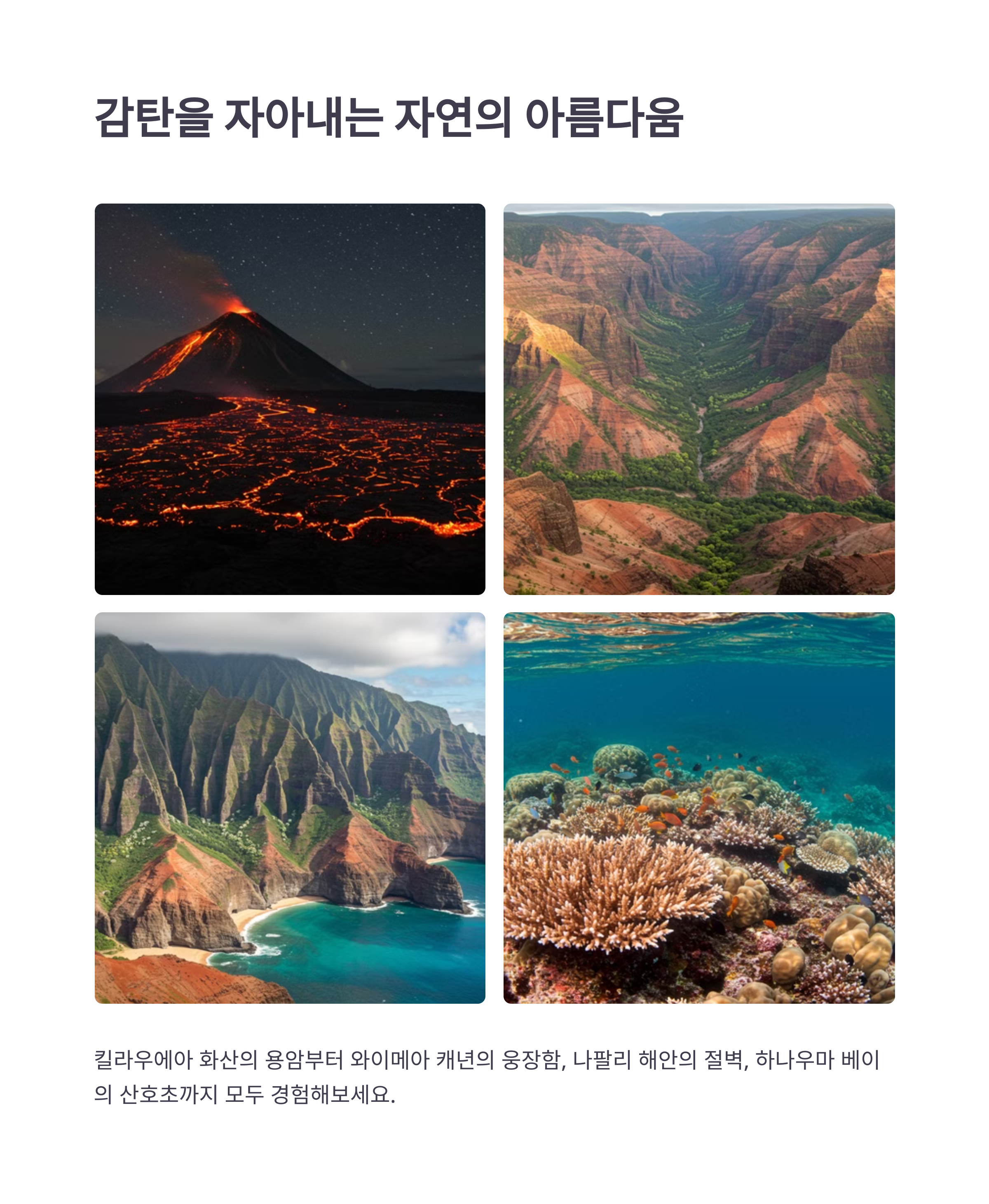 하와이의 가장 큰 매력은 바로 다채로운 자연 경관이에요. 🌈 활화산에서 뿜어져 나오는 용암을 직접 볼 수 있는 킬라우에아 화산국립공원은 지구의 신비로움을 느낄 수 있는 곳이에요.