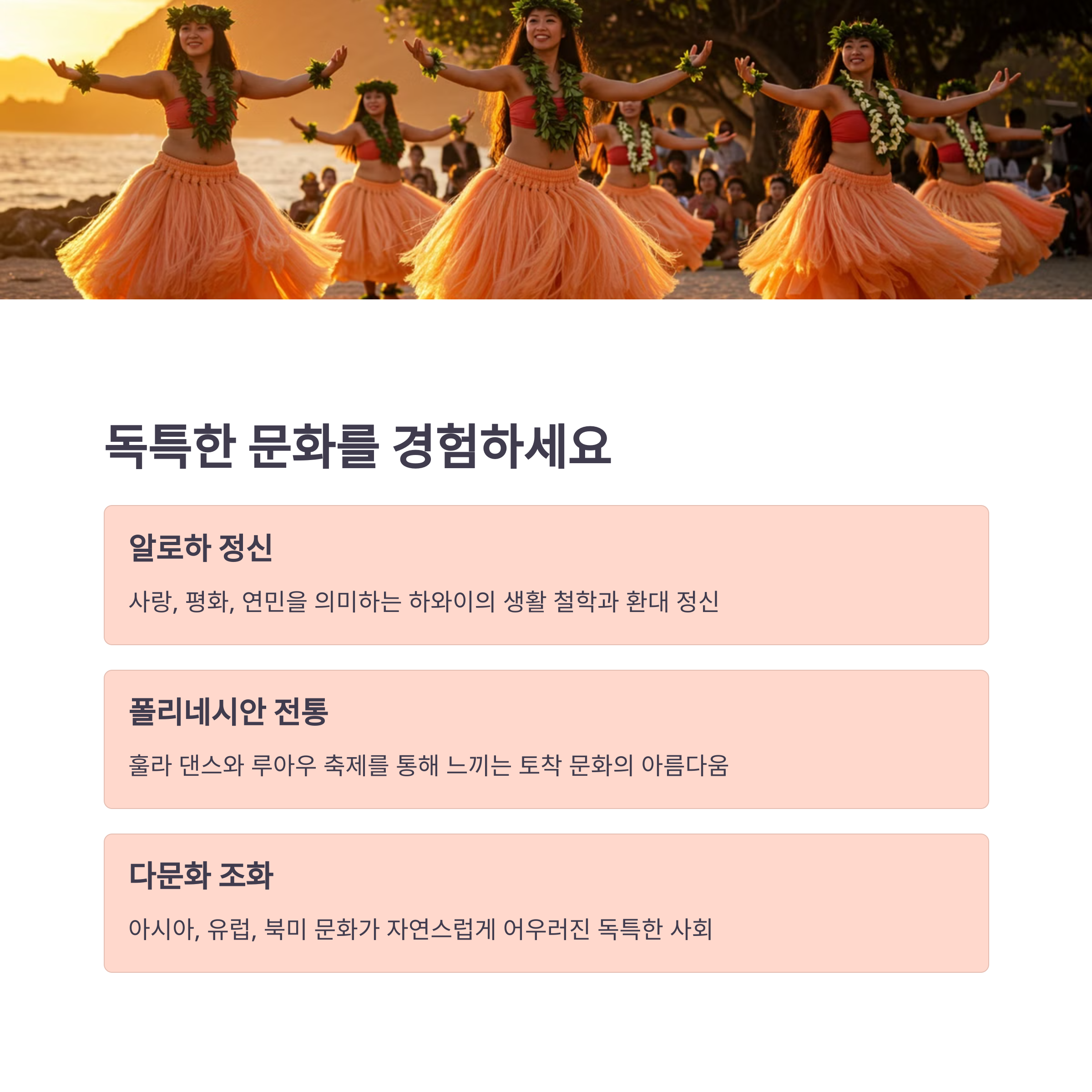 하와이는 폴리네시안 문화와 북미 문화가 융합된 독특한 문화를 가지고 있어요. 전통 춤인 훌라를 배워보거나, 루아우(전통 축제)에 참여해 보는 것도 좋은 경험이 될 거예요. 😄