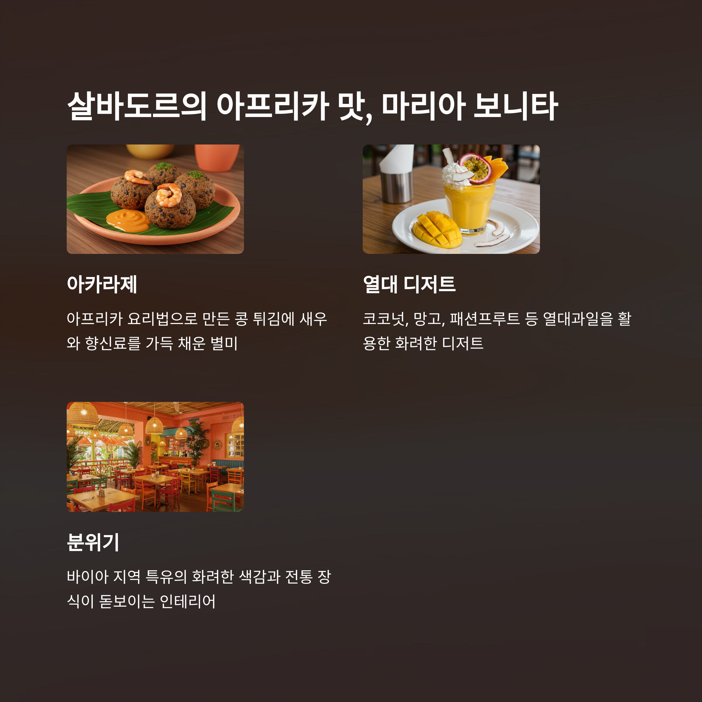 🍽️ 살바도르에서는 '레스토랑테 마리아 보니타'의 아카라제가 일품이에요. 아프리카 영향을 받은 바이아 요리를 정통으로 맛볼 수 있어요.