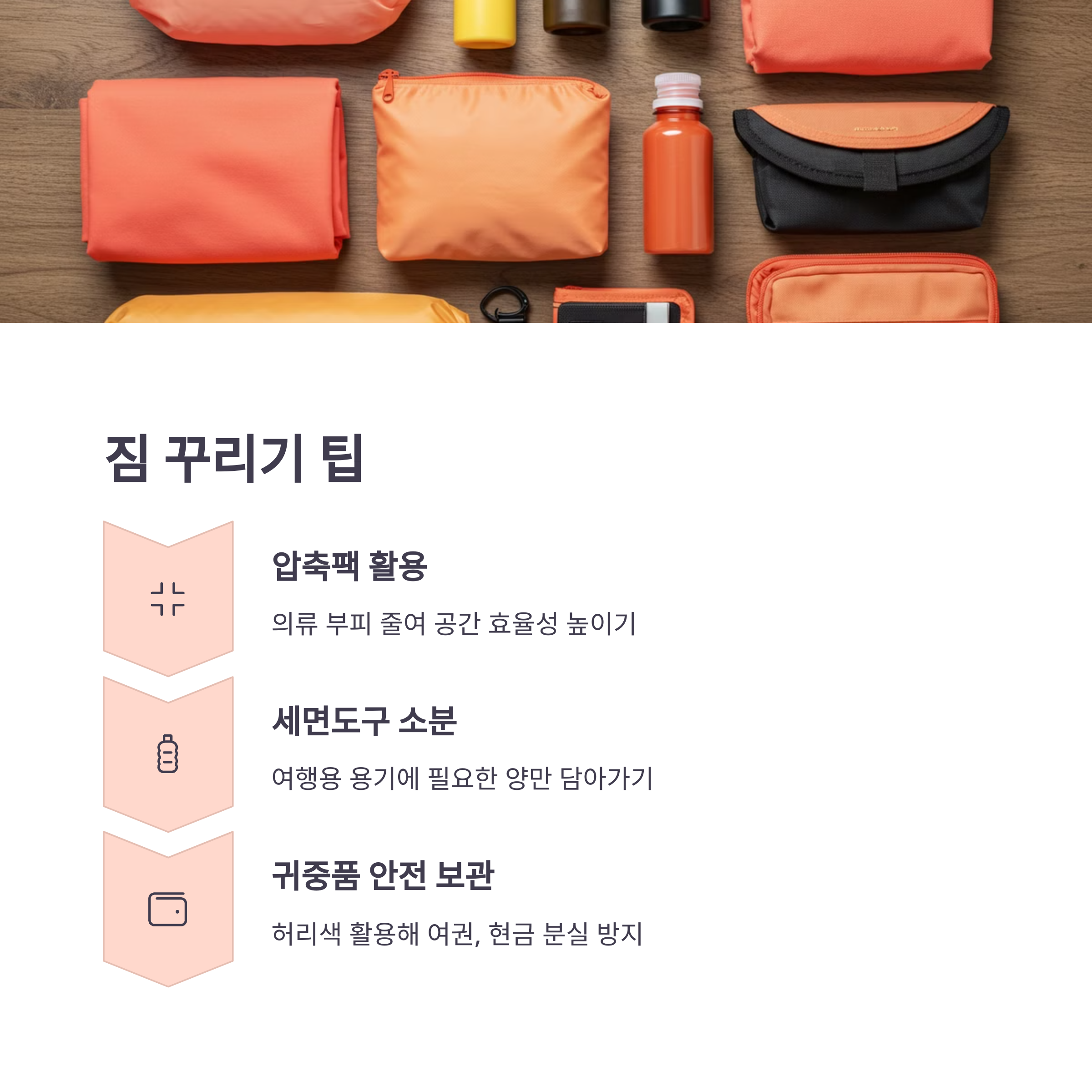 마지막으로 모든 준비물을 효율적으로 꾸리는 방법을 알려드릴게요. 압축팩을 활용하면 의류 부피를 획기적으로 줄일 수 있어요.