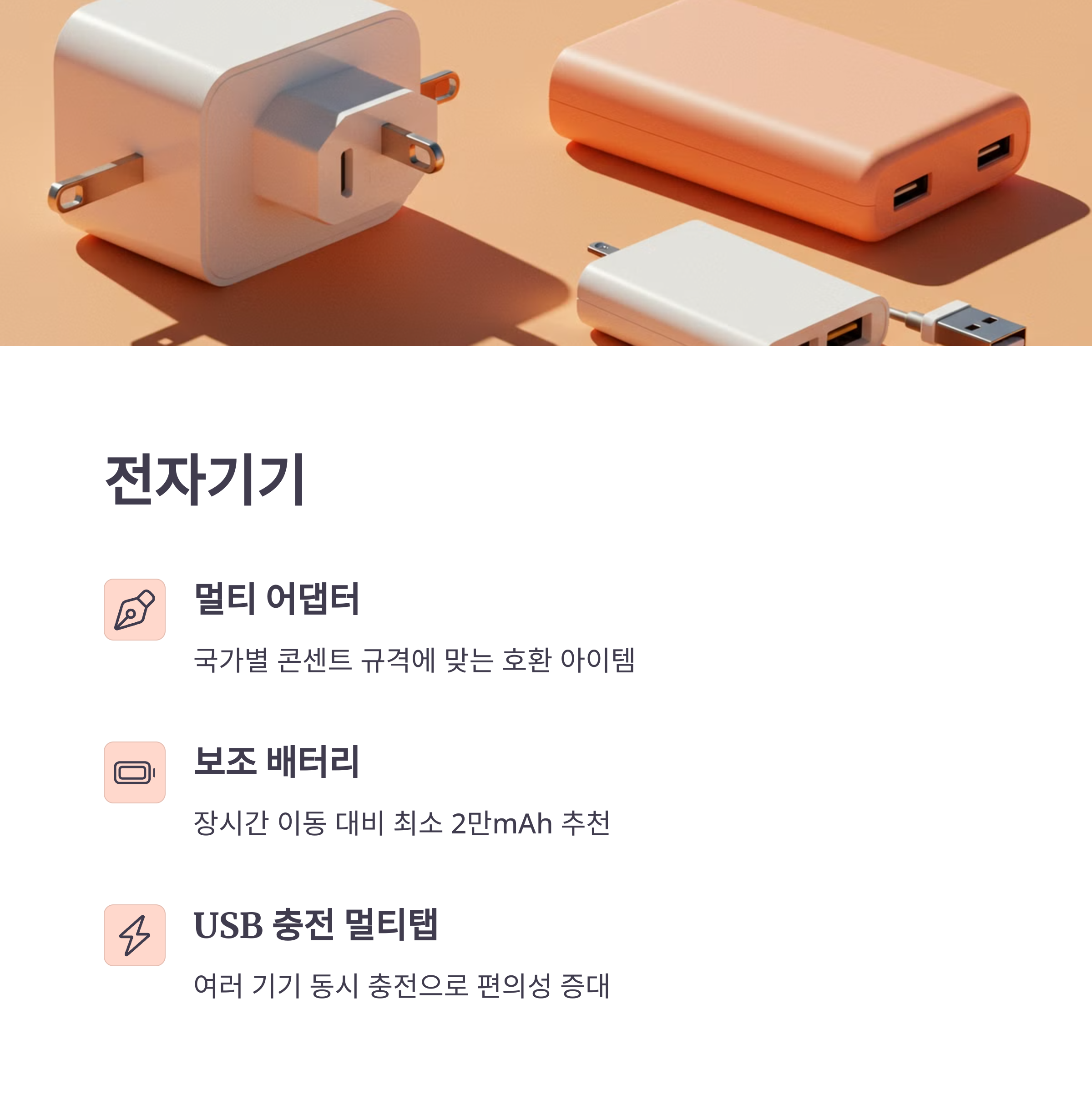 현대 여행에서 전자기기는 우리의 든든한 동반자예요. 특히 중남미는 국가마다 전압과 콘센트 규격이 다를 수 있으니 멀티 어댑터는 꼭 챙기세요! ⚡