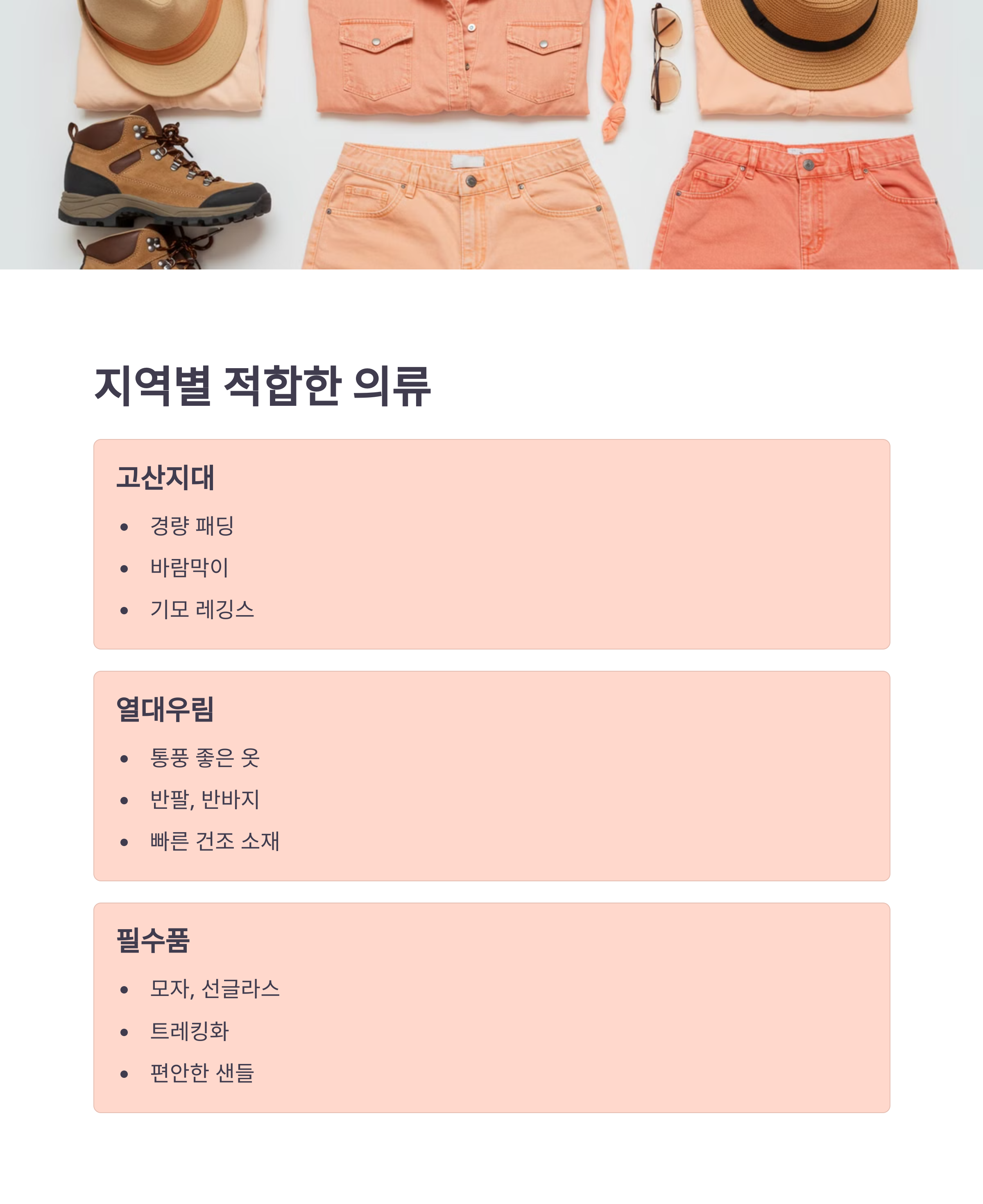 기본적으로 햇빛 차단을 위한 모자와 가볍고 통풍이 잘 되는 옷은 필수! 그리고 쾌적한 여행을 위해 땀 흡수가 잘 되는 기능성 속옷도 챙겨가세요. 💦