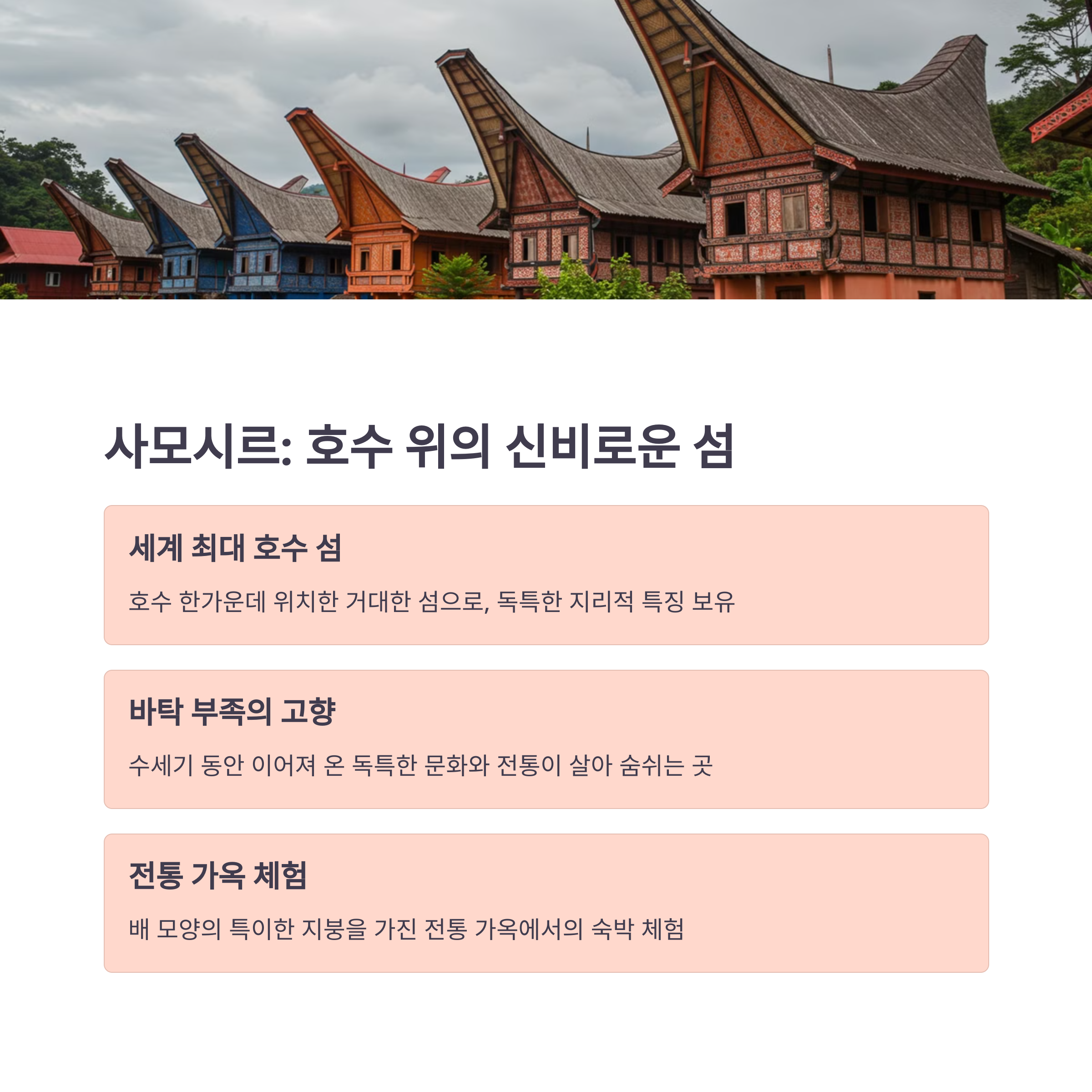 가툰 호수 주변에는 바탁(Batak) 부족의 전통 마을들이 있어요. 독특한 뾰족지붕 형태의 전통 가옥들은 호수 풍경과 어우러져 더욱 이국적인 분위기를 자아내죠.