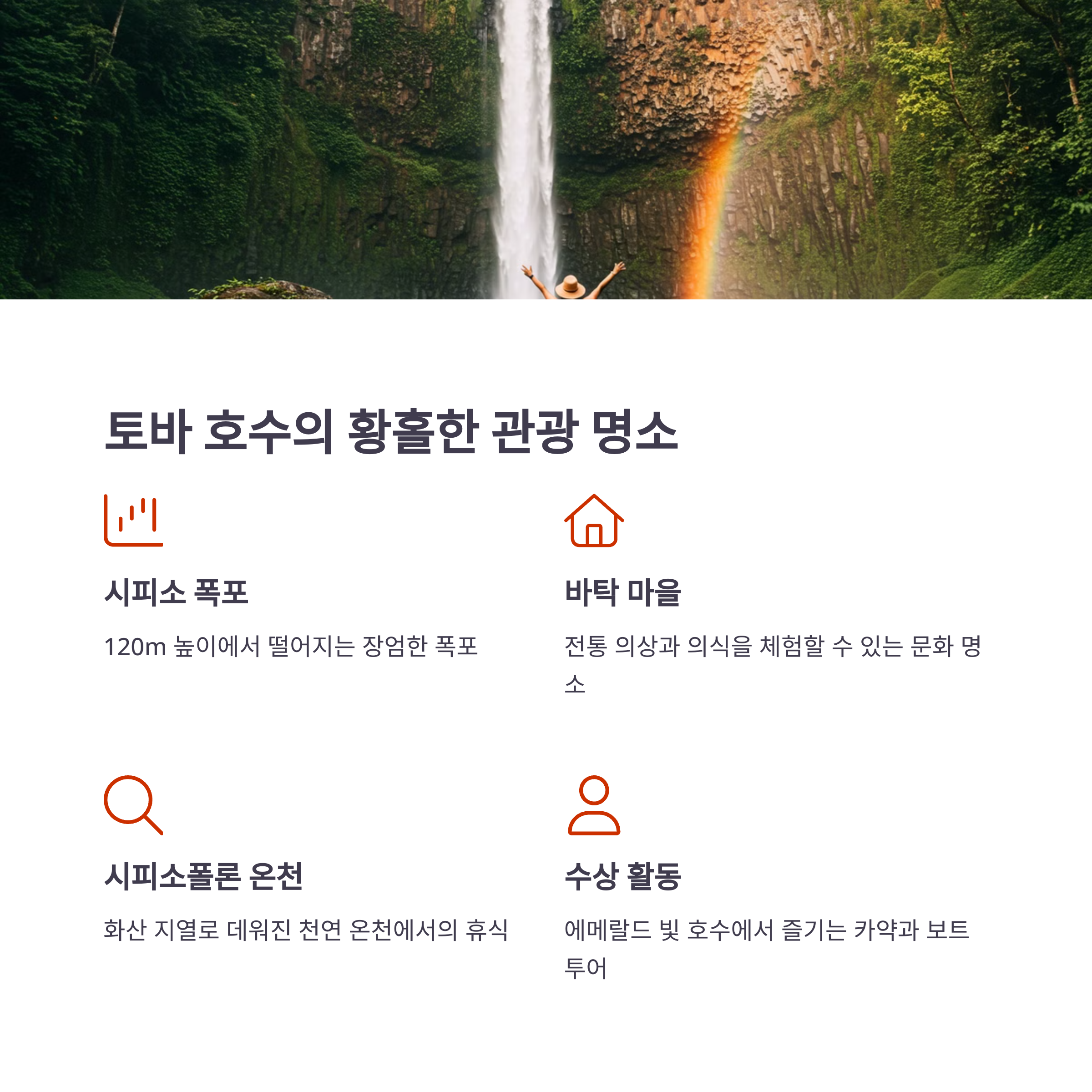 A: 전통 배를 타고 호수를 둘러보는 보트 투어와 삼오시르 섬 트레킹이 인기 있어요. 또한 현지 바탁 부족의 전통 춤 공연을 관람하는 것도 특별한 경험이 될 수 있답니다.