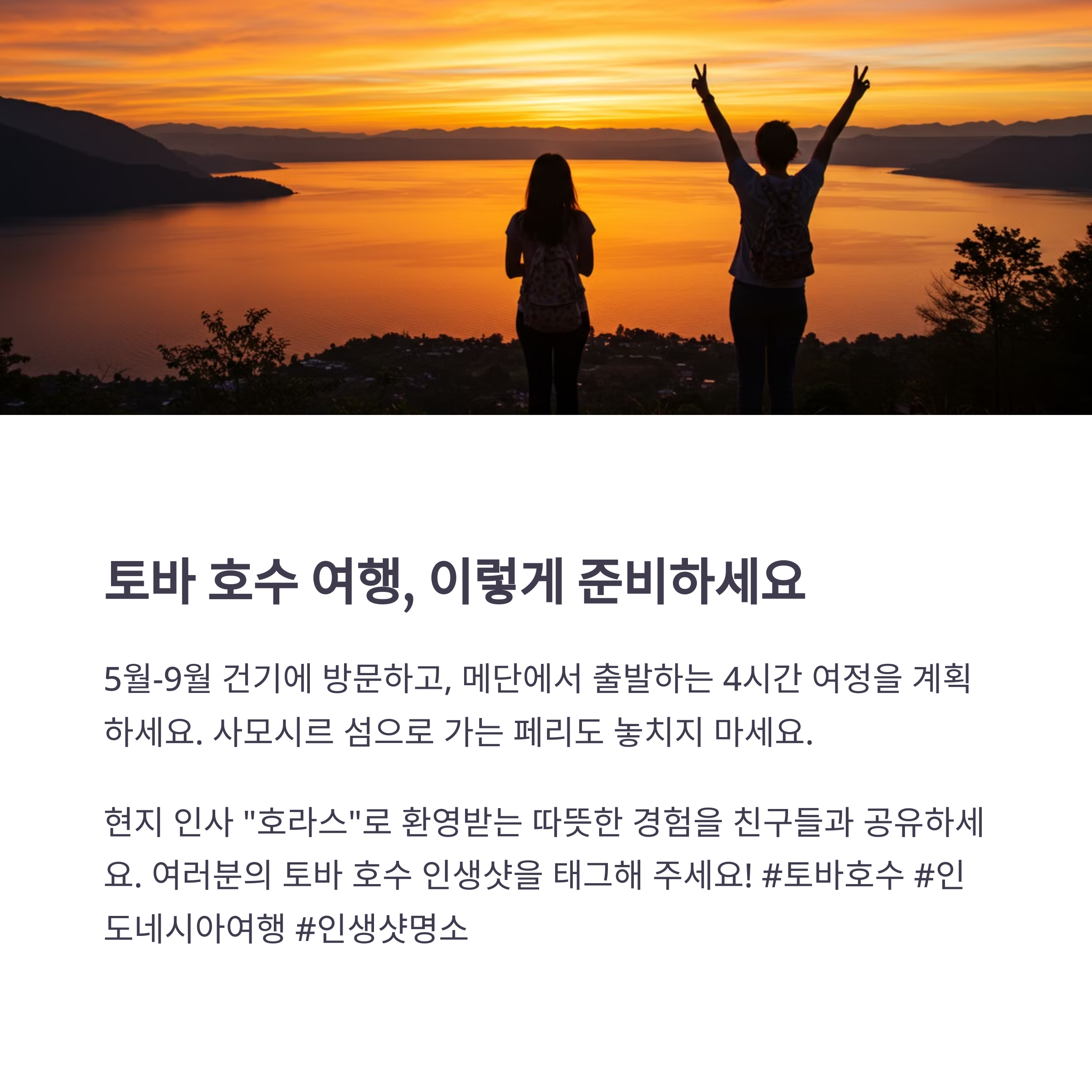 또한 계절이나 특정 장소에 맞춘 #TobaLakeSunset #SamosirIsland #BatakCulture 같은 구체적인 해시태그를 활용하면 관심 있는 사람들에게 더 효과적으로 다가갈 수 있답니다. 😊